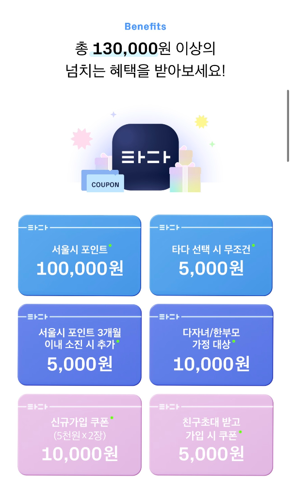 2025년에는 운영업체가 변경되었어요. 이제 '타다(TADA)' 업체 이용할 수 있습니다. 신청할 때 미리 앱을 설치해두면 포인트 지급이 더 빨라요!