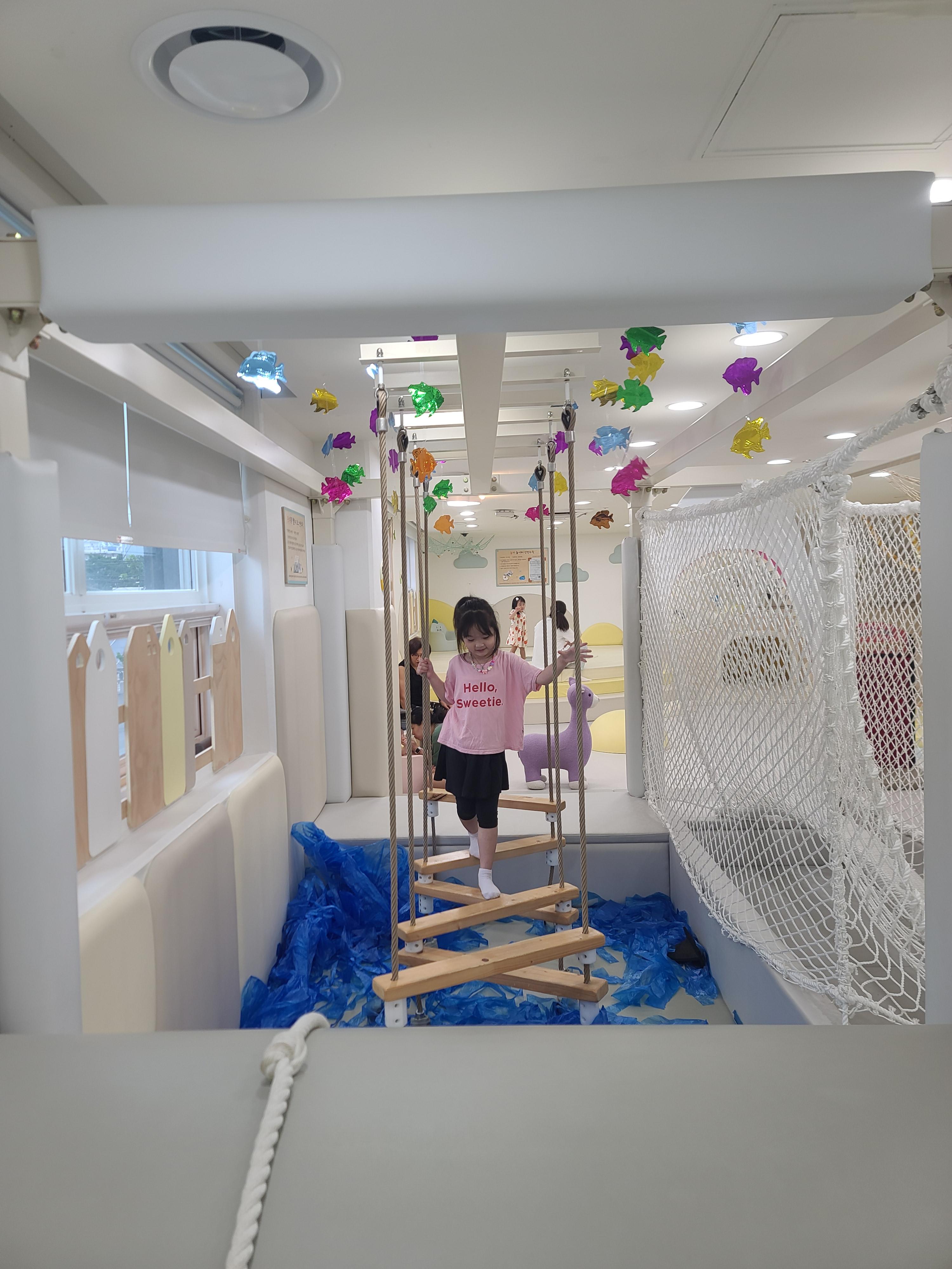 나무 발판을 하나씩 건너고 마지막엔 로프를 오르는 스릴 만점 코스에요. 바다를 건너는 컨셉인데, 균형감각과 아이들의 용기를 길러준대요!