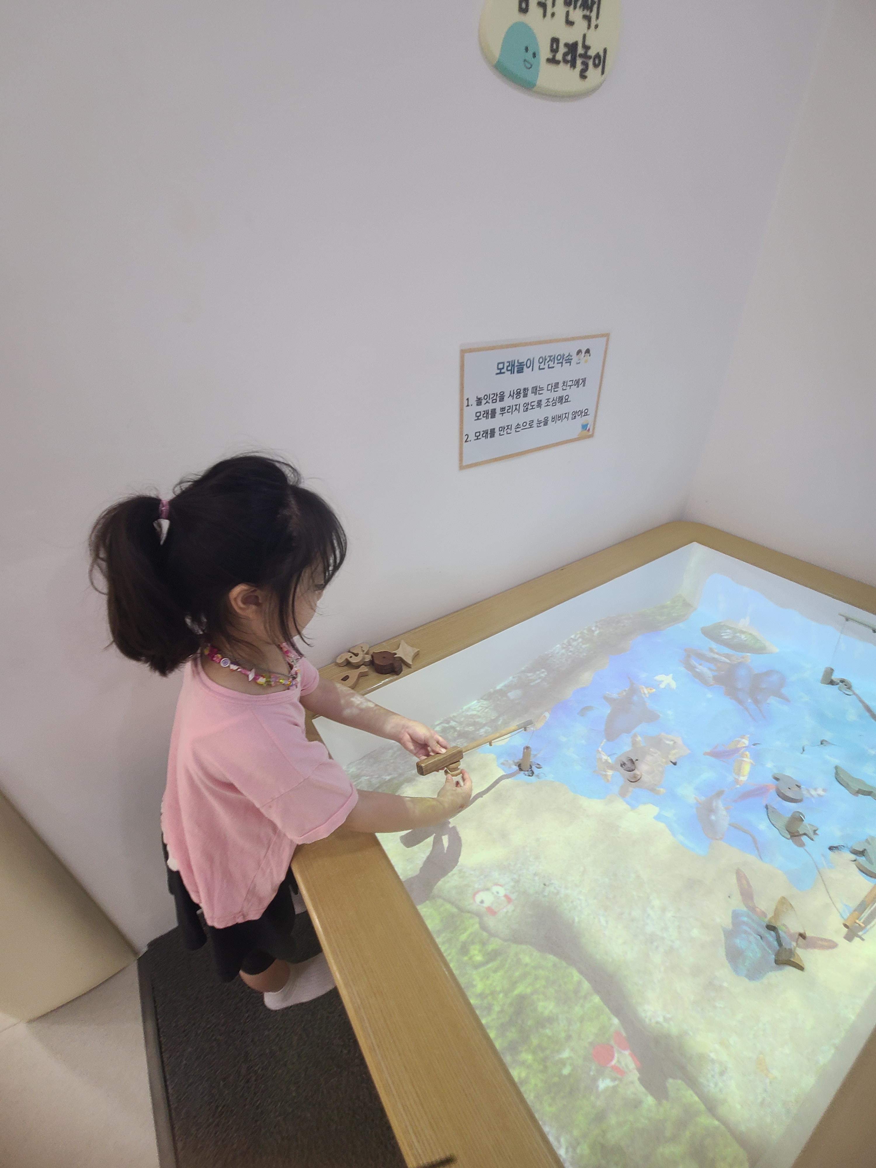 모래놀이를 하면 촉감 발달에 좋다는데 요새 모래놀이하기 힘들죠? 한번 체험해보세요. 바닷속 영상이 같이 나와서 조개랑 물고기들이 움직임에 반응해요.
