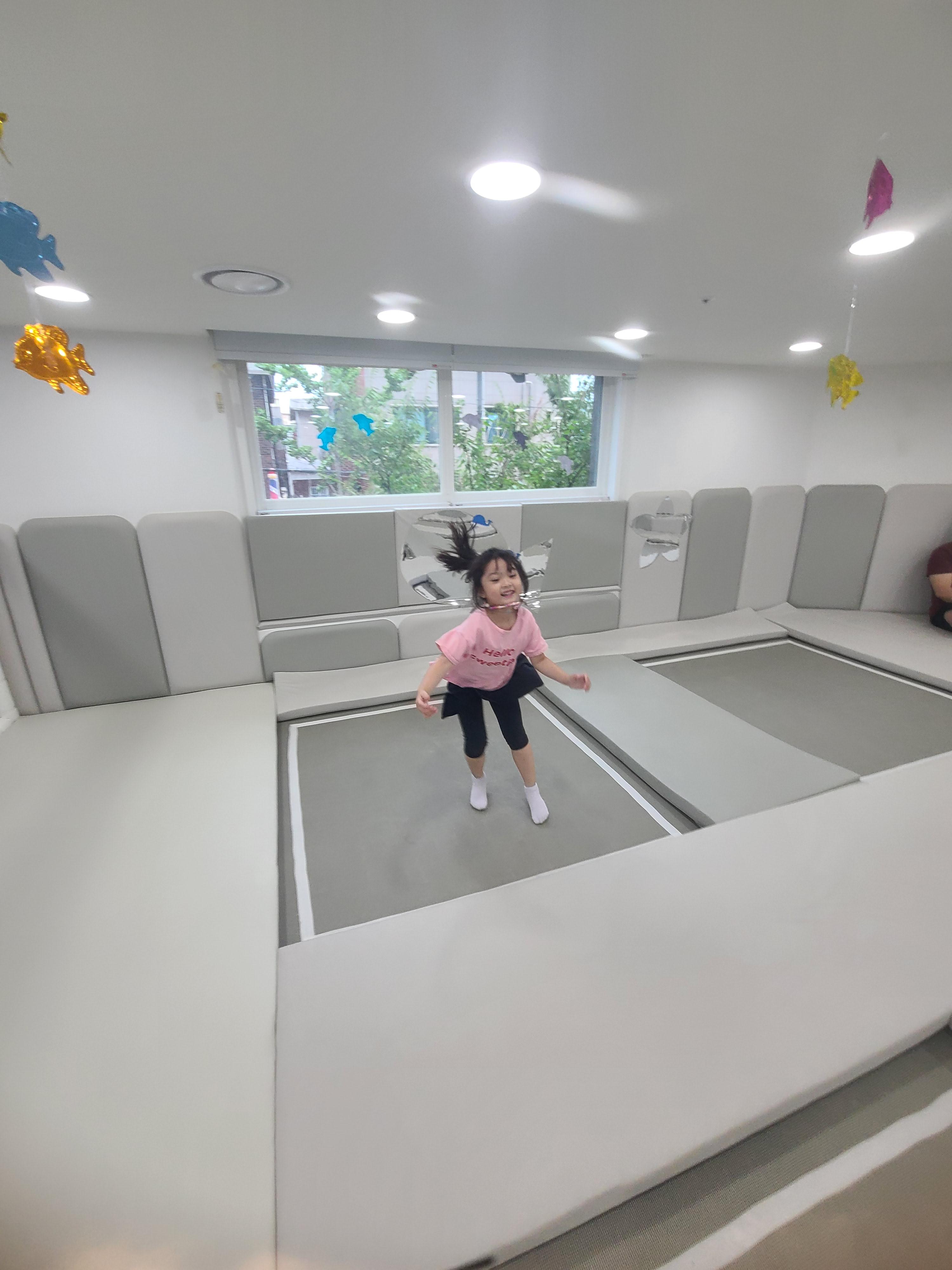 안전매트가 깔려있어서 뛰어도 안전하고, 트램펄린이 8개나 있어서 마음껏 돌아다니며 체력 발산하기 딱 좋아요.